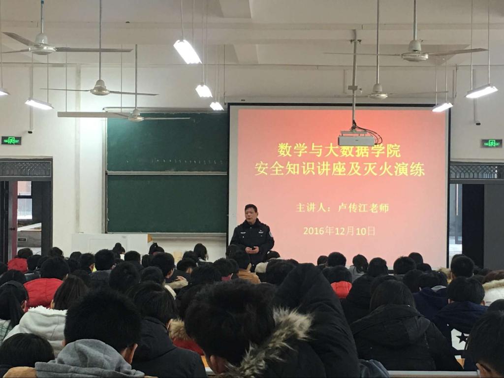 12月10日下午,数学与大数据学院邀请到校保卫处消防科卢传江老师在山南校区给2016级学生做了一场安全知识讲座及灭火演练。学院副院长(主持工作)方贤文、党委副书记兼行政副院长李勇、2016级辅导员及全体学生参与此次活动。