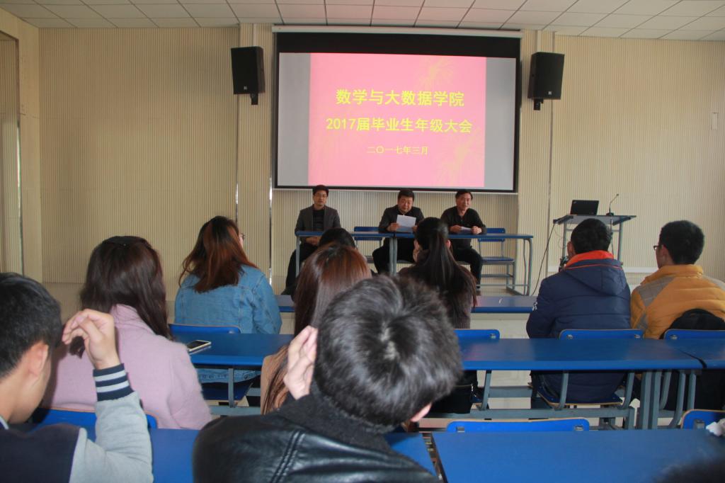 3月10日下午,数大学院在院报告厅召开2017届毕业生年级大会。院党委副书记(主持工作)赵前进教授,副院长(主持工作)方贤文教授及党委副书记兼副院长李勇出席会议。会议由院党委副书记兼副院长李勇主持,毕业班辅导员及120余名毕业生参加大会。