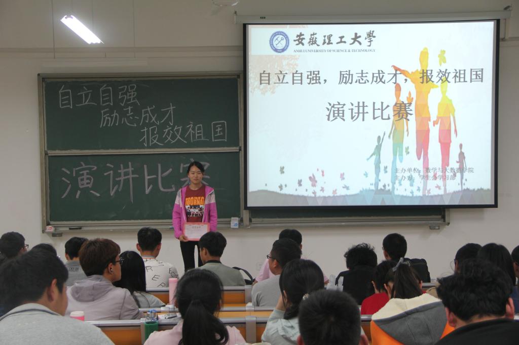 为宣传我院学生励志成才的优秀典型事迹,发挥好资助育人功能,教育和引领广大学生板固树立责任意识和感恩意识,激发他们自立自强、志存高远、追求卓越、报效祖国的热情。4月26日晚上,数学与大数据学院在天工南楼302教室举办的“自立自强,励志成才,报效祖国”演讲比赛。数大学院十几余名同学参加比赛,数大学院2016级部分同学观看了比赛。
