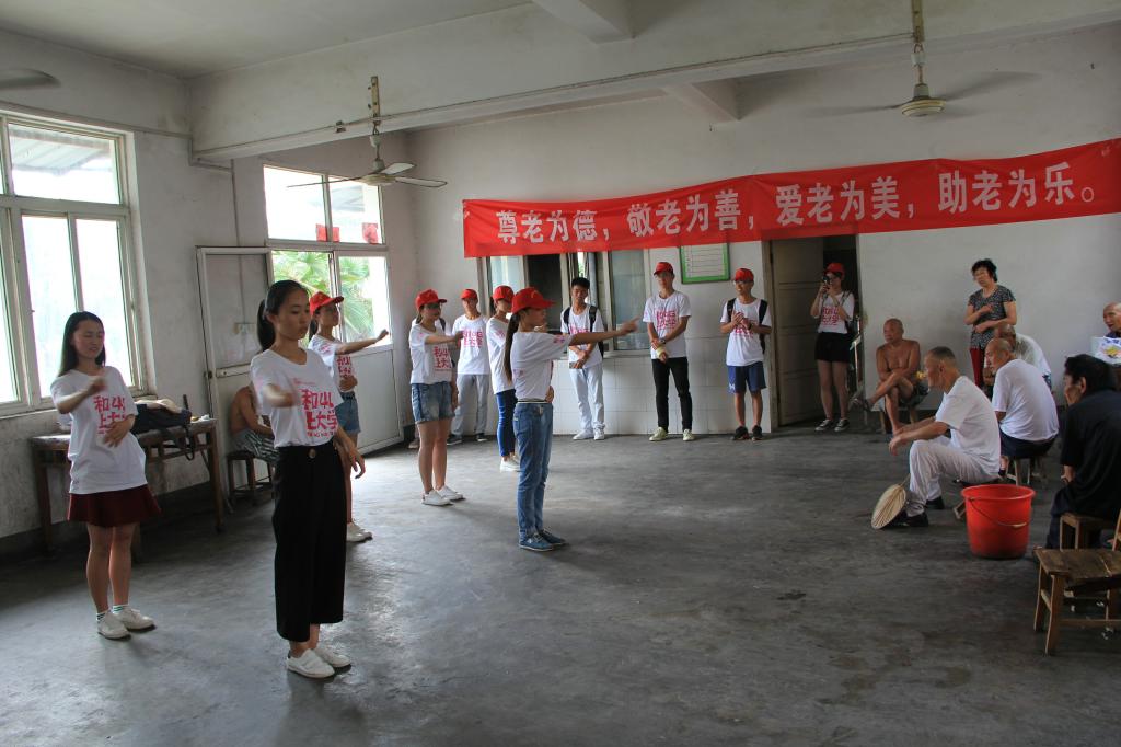 志愿者们有的陪老人坐在树荫下,听老人畅聊过去的故事,有的陪老人在院子里散步,听老人介绍这里的一草一木,有的和老人一起在电视机前观看新闻,听老人说说党和他们的故事。谈话之余,志愿者们将带来的西瓜、香蕉等水果分发给老人们。对于行动不便的老人,志愿者们将水果送进了他们的房间。接着志愿者为老人们表演了精心准备的节目,小提琴曲《渔舟唱晚》、校歌《大学无疆》、老歌《枉凝眉》、手语舞《国家》轮番上场,让老人们赞不绝口。最后,志愿者们为老人清扫了院子和房间,让老人们生活的更舒适。