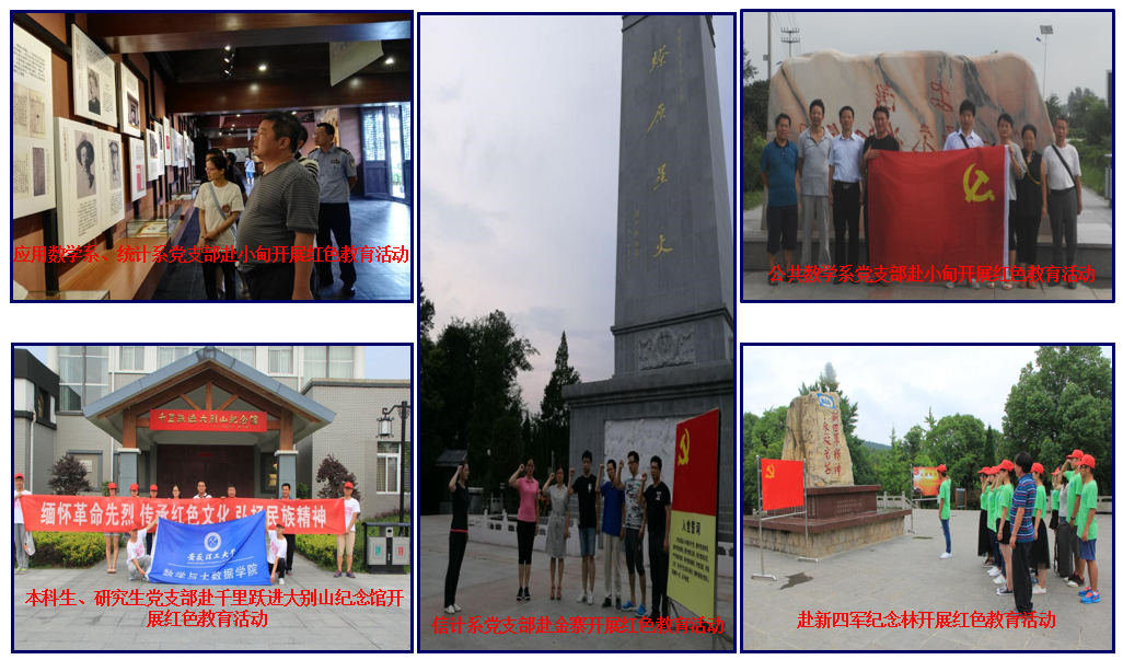 7月1日至8月20日期间,数大学院六个党支部分别赴千里跃进大别山纪念馆、金寨、寿县小甸、新四军纪念林等地接受党性教育,追忆革命历史,缅怀先烈,陶冶思想,接受爱国主义教育和革命传统教育。党员们通过实地参观和学习,切身感受到了革命先烈不屈不挠的革命精神,使大家深深体会到现在和平幸福生活的来之不易,更加坚定了大家向革命英雄学习,以更高的激情投入到工作和学习中去。