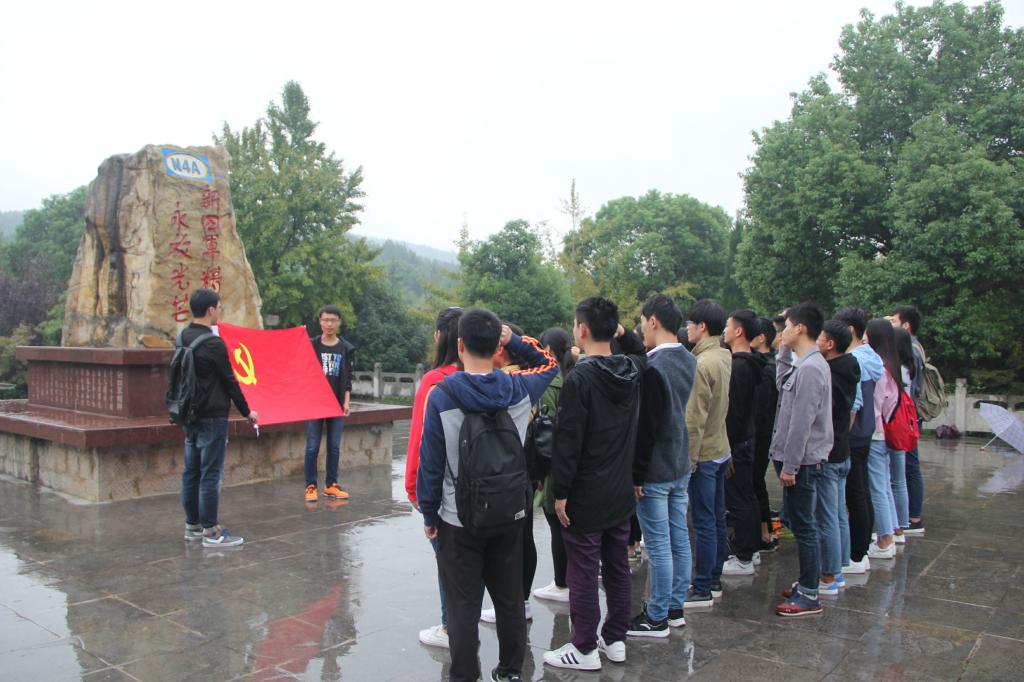 在新四军纪念碑前全体党员面对鲜红的党旗,右手握拳高高举起,立下对党忠诚的誓言,表达为党的事业奋斗终身的决心与意愿。党员们纷纷表示,中国共产党带领中国人民从血雨腥风年代走来,就是为了实现中华民族伟大复兴的中国梦。大家表示要结合“两学一做”精神实质,强化理想信念,牢记使命,不忘初心,继续前进。(撰稿、核稿:数大学院郑甜甜、李勇)