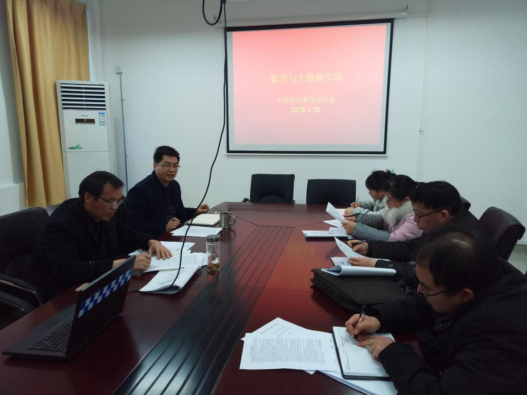 2018年1月10日下午,数学与大数据学院本科教学工作审核评估整改动员会在院会议室召开。院长方贤文、副院长李德权和各系主任、实验室主任参加了本次大会。