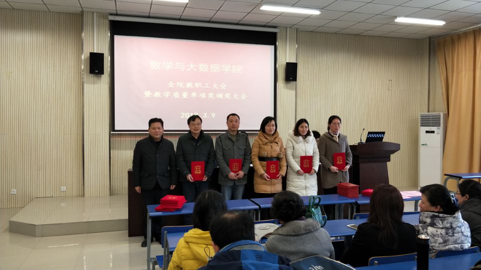 3月9日下午,数学与大数据学院在学院报告厅召开全体教职工大会暨颁奖大会。教务处副处长王开松应邀出席大会,院领导与全体教职工参加大会,会议由院党委书记赵前进主持。