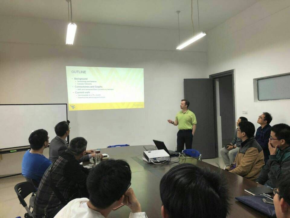 Edgar Fuller教授先简要介绍了相关图论知识及网络分析技术和算法,重点介绍了其团队基于收集到的老鼠眼睛中各种视杆和视锥神经细胞、无长突神经细胞、双极细胞、神经节细胞等的感知数据,将数据进行处理并结合相关网络分析技术建模得到老鼠视网膜神经网络,进而研究了老鼠视网膜神经网络的社团结构、模体划分等问题并给出了相应的生物学解释。Edgar Fuller教授的报告内容详实,展示了图论和网络科学在生物信息学中的具体应用,引起了在座师生的广泛兴趣,并积极与Edgar Fuller教授进行交流。
