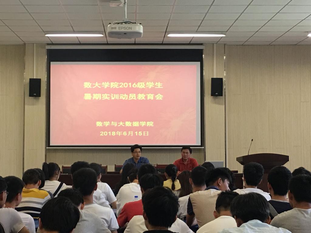 2018年6月15日,数大学院在学院楼一楼报告厅举行全体2016级学生暑期实训动员会。学院院长方贤文、党委副书记兼副院长李勇、2016级辅导员参加会议。会议由李勇主持。