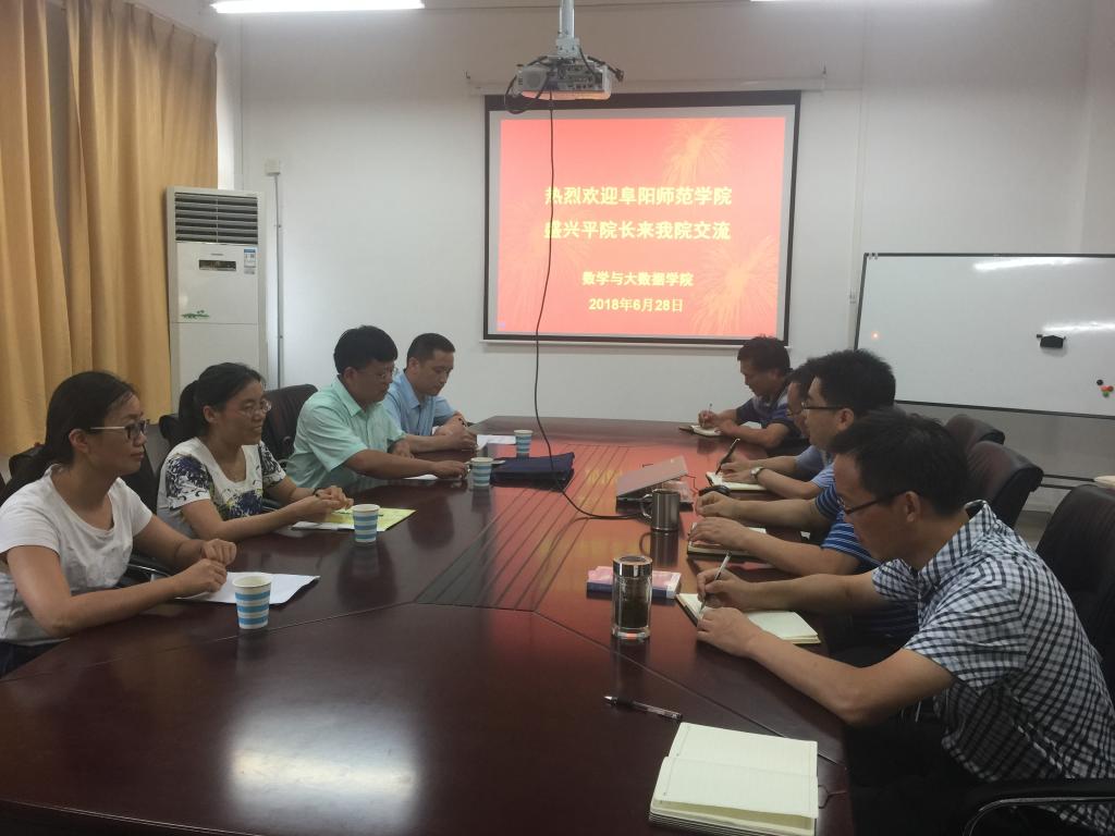 6月28日下午,阜阳师范学院数学与统计学院院长盛兴平等一行4人来数大学院就研究生联合培养开展交流,院领导、部分导师及联合培养研究生参加了此次交流会,方贤文院长主持会议。