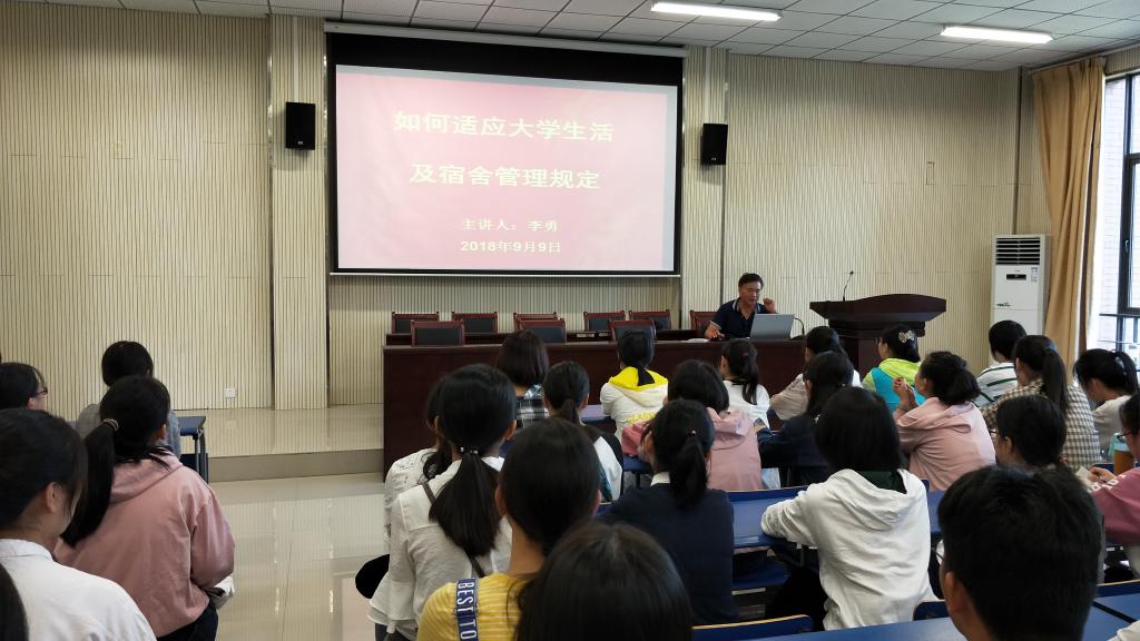 2018年9月9日上午,数大学院在学院一楼报告厅举行了如何适应大学生活与宿舍管理规定的专题教育。数大学院党委副书记兼副院长李勇担任主讲, 2018级全体新生参加。