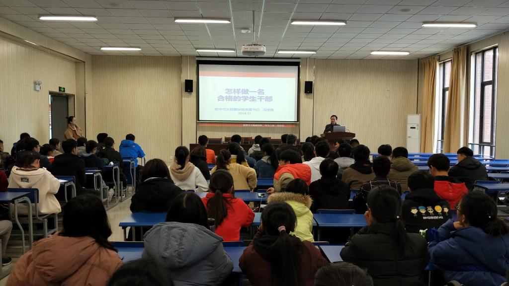 11月21日中午,数学与大数据学院2018年青年马克思主义者培养工程暨学生干部和入党积极分子培训班在明道楼一楼报告厅正式开班。院党委副书记李勇、各年级辅导员以及新生班主任应邀出席开班仪式。院学生会干事、2018级所有班级学生干部和入党积极分子等84名同学参加了本次培训。