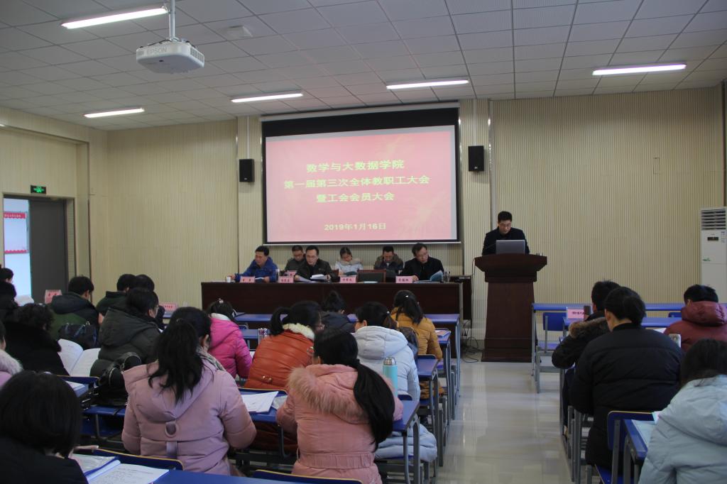 1月16日,数学与大数据学院一届三次教职工大会暨工会会员大会在院报告厅隆重召开。大会开幕式由院党委书记冯定昌主持。全体教职工参加会议,大会还特邀了退休教师、学生代表等列席了会议。