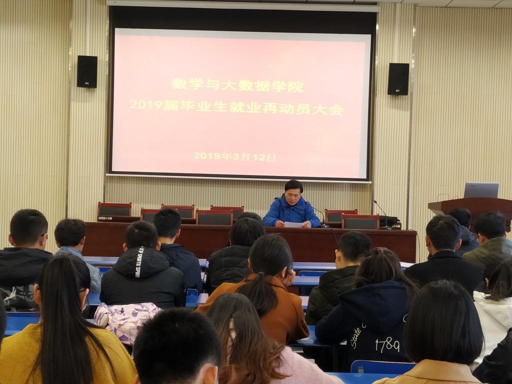 3月12日下午,数学与大数据学院在明道楼一楼报告厅召开2019届毕业生就业再动员大会。院党委副书记李勇、毕业班辅导员王晓悦及2019届在校毕业生参加会议。