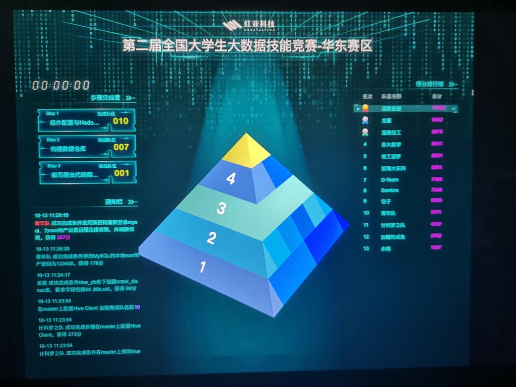 第二届”全国大学生大数据技能竞赛"由中国大数据技术与应用联盟发起,中国农业大学、北京邮电大学、浪潮软件集团和红亚科技有限公司共同承办,华东分赛区选拔赛则由合肥学院承办。本次比赛以3人团队的形式,要求参赛选手在2小时30分钟内完成Hadoop大数据环境搭建、Hive分布式数据仓库创建、论坛数据爬取以及数据存储等一系列操作,竞赛采用系统平台自动评分并实时排名展示。