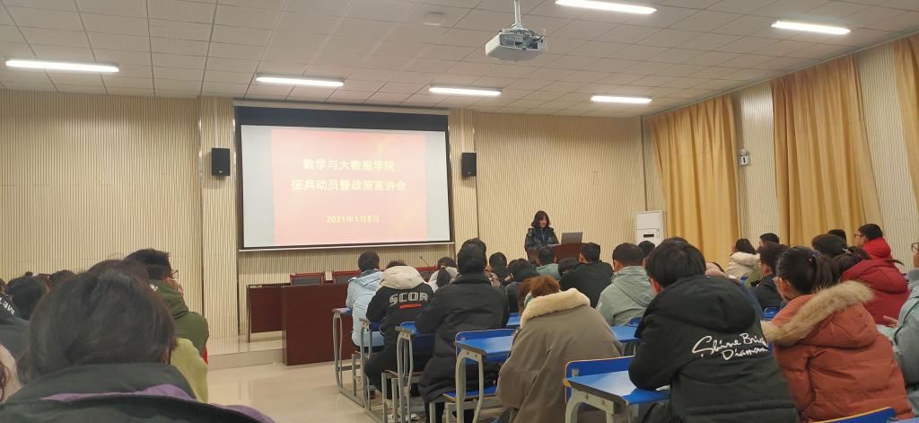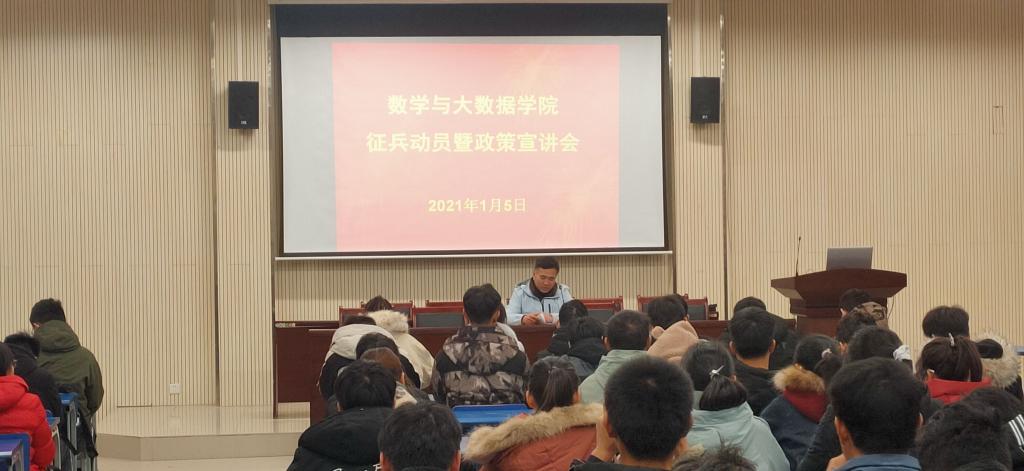 为做好2021年征兵工作,积极动员大学生参军入伍,报效祖国。数学与大数据学院1月5日中午在学院报告厅召开了2021年大学生征兵工作动员暨政策宣讲大会。院党委副书记李勇、全体辅导员及200余名本科生参与动员大会,会议由院党委副书记李勇主持。