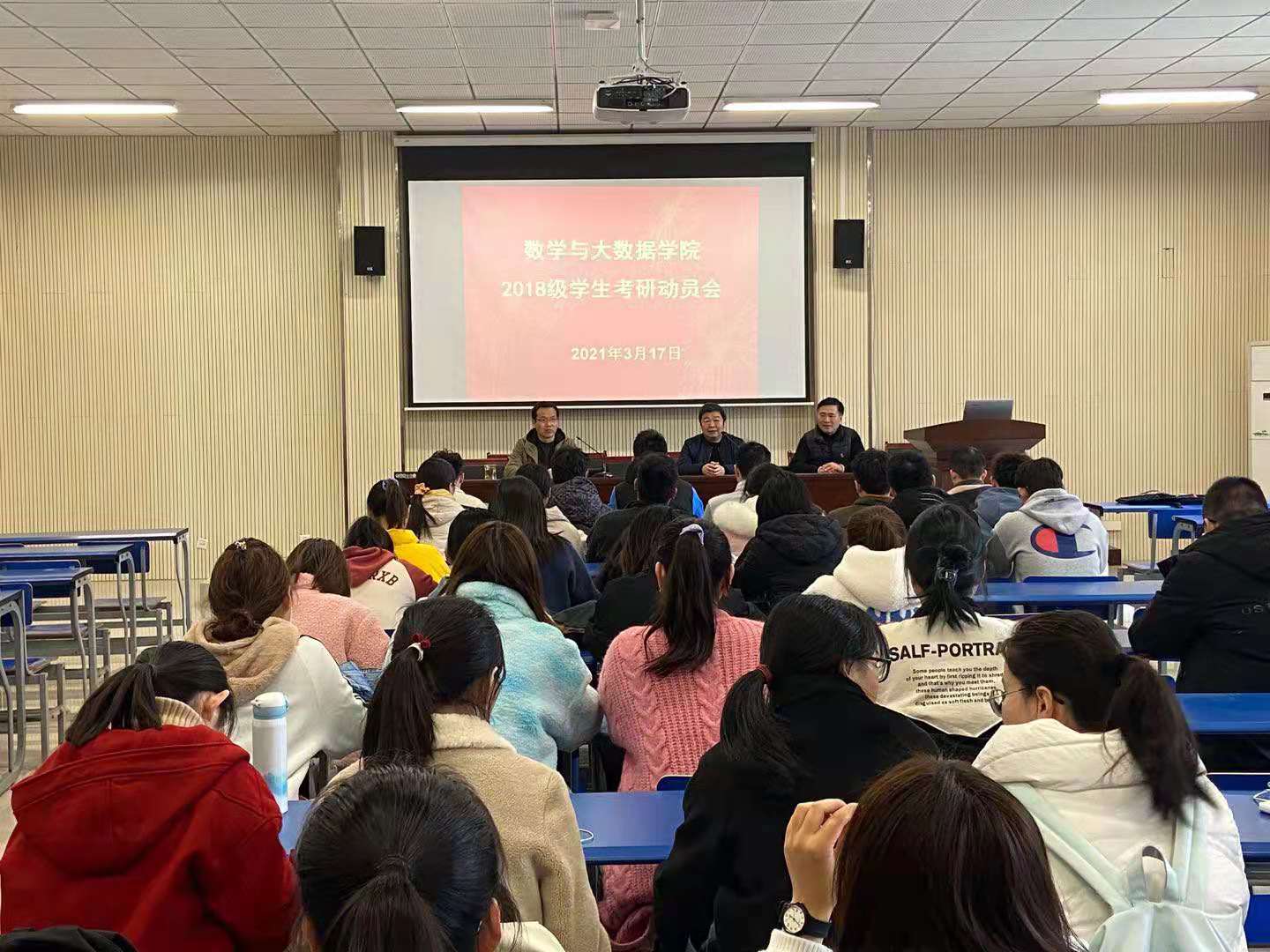 为全面调动2018级学生的考研积极性、明确考研目标、掌握考研技巧、提升考研竞争力,数学与大数据学院3月17日中午于学院一楼报告厅召开2021年考研动员会。院长赵前进、院党委副书记李勇、副院长李德权及2018级辅导员、2018级全体学生参会。会议由院党委副书记李勇主持。