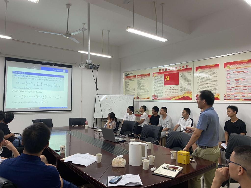 吴然超教授首先介绍了极限环的图灵不稳定性,然后详细地给出了Depletion-type Gierer-Meinhardt模型的分岔曲线和解的动力学行为。最后,吴教授和青年教师和研究生就相关学术问题进行了深入地讨论。报告会现场学术氛围浓烈,师生们热烈交流讨论。