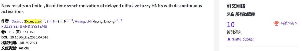 根据ESI最新统计数据显示,数学与大数据学院段炼副教授以安徽理工大学为第一单位在《Fuzzy Sets and Systems》(影响因子:3.343,JCR、中科院一区)期刊上发表的学术论文“New results on finite-/fixed-time synchronization of delayed diffusive fuzzy HNNs with discontinuous activations”(出版日期:2021年7月30日)被ESI数据库遴选为高被引论文,这是继2019年段炼副教授在该期刊首篇之后的第二篇ESI高被引论文。