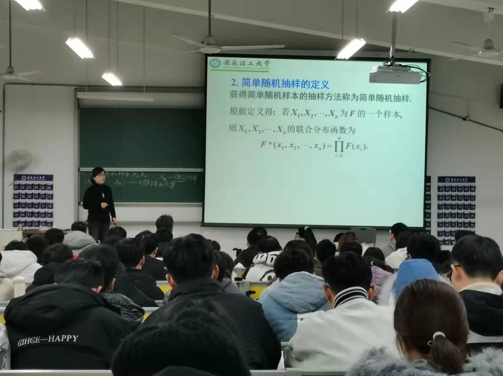此次课程思政示范教学活动由詹倩副教授主讲,授课内容为《概率论与数理统计》课程中的“样本与统计量”。詹倩老师首先分别从演绎和归纳的角度证明或验证学生们熟悉的命题“三角形内角之和为180°”,引出概率论和数理统计学的区别,进而介绍了数理统计在金融、保险、经济与企业管理、工农业生产、医学、地质学、气象与自然灾害预报等等方面的重要作用,激发了学生的学习兴趣和爱国情怀。在讲解样本的容量时,詹老师通过解释样本容量越大,实验结果的平均值越接近数学期望值,得出事物的发展一直是存在于辩证的对立统一中,让同学们理解量变到质变的辩证关系。