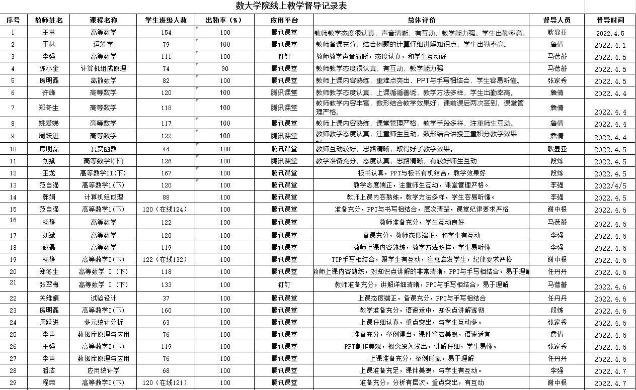 开展线上教学以来,学院强化线上教学督导,加强对线上教学质量的监控,制作了《数大学院线上教学督导记录表》,要求督导组成员每天线上听课,全面了解授课教师的教学状态和教学过程,对存在的问题提出改进措施并及时进行反馈。两周来,学院领导和院督导组共听课42节次,线上教学总体平稳有序,授课教师都能够认真开展线上教学,教学手段丰富多样,教学水平不断提高。