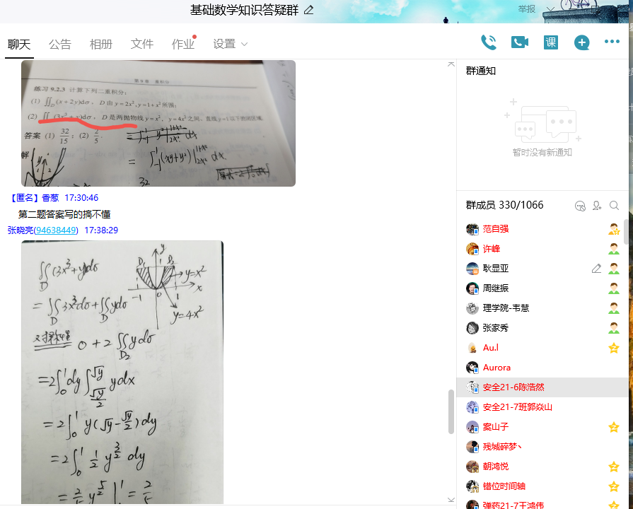 依据量大面广的数学基础课教学特点,学院确定了分层次指导方案,力争提高数学基础课线上教学质量。加大线上教学的辅导力度,在原有2021级三个高数I、高数II答疑辅导群(容量分别为3000,2000,2000)的基础上,加大老师进群答疑力度,由原来的每天5位老师,提高到每天10位老师在线答疑,对一些重点、典型问题,答疑老师定期归纳、汇总,做成群文件,发给所有同学。为降低数学基础课补考率,又专门建立了一个数学基础知识答疑群,每周提供基础知识题目,加强与数学基础知识薄弱学生的互动,调动学生学习的积极性,效果明显。