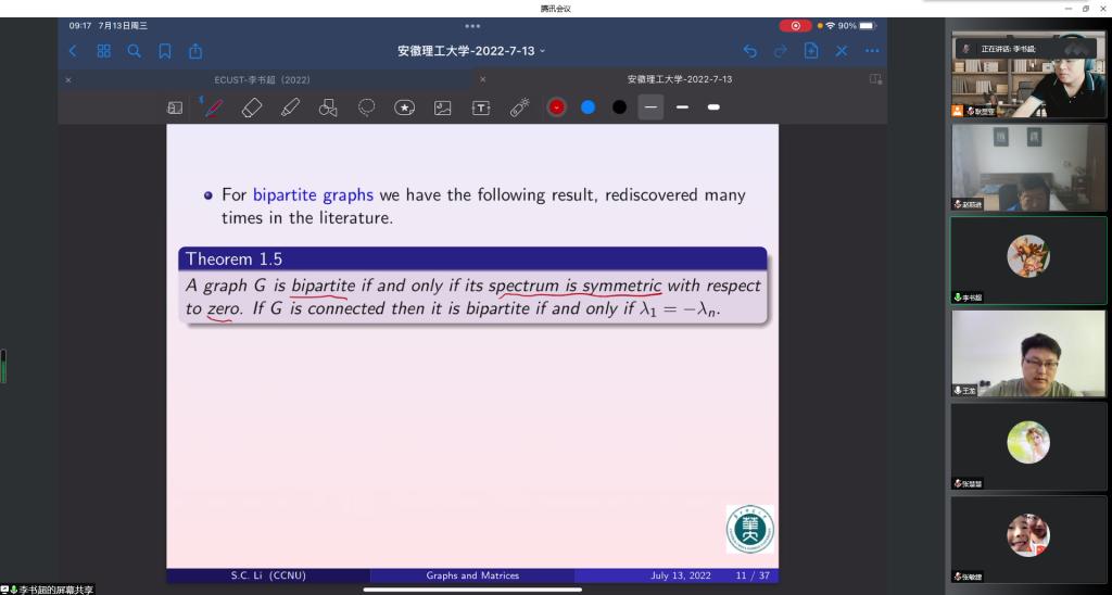 7月13日上午,应科研部和数大学院的邀请,华中师范大学李书超教授通过腾讯会议作了“Graphs, Digraphs, Mixed Graphs and Their Corresponding Matrices”的学术报告。院长赵前进主持报告会,学院部分青年老师和研究生50余人听取了报告会。