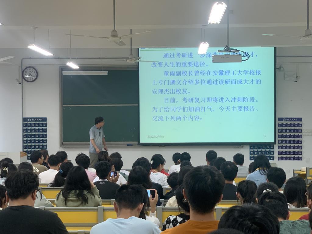 9月27日下午,数学与大数据学院于明理南316教室召开2023届毕业生考研动员会暨交流指导会,学院院长赵前进、副书记马蓓蕾、许峰教授、方欢教授做考研动员与指导,会议采取线上线下相结合的方式,共180余名学生参加会议,会议由院长赵前进主持。