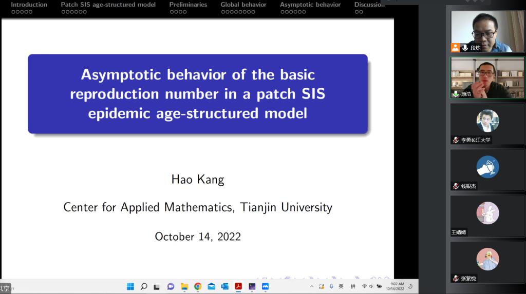 10月14日上午,应科研部和数大学院的邀请,天津大学康浩博士应邀作了题为“Asymptotic behavior of the basic reproduction number in a patch SIS epidemic age-structured model(一类斑块SIS传染病年龄结构模型基本再生数的渐近行为)”的线上学术报告。副院长段炼主持报告会,50余名相关研究方向的教师和硕士研究生认真聆听了本次报告。