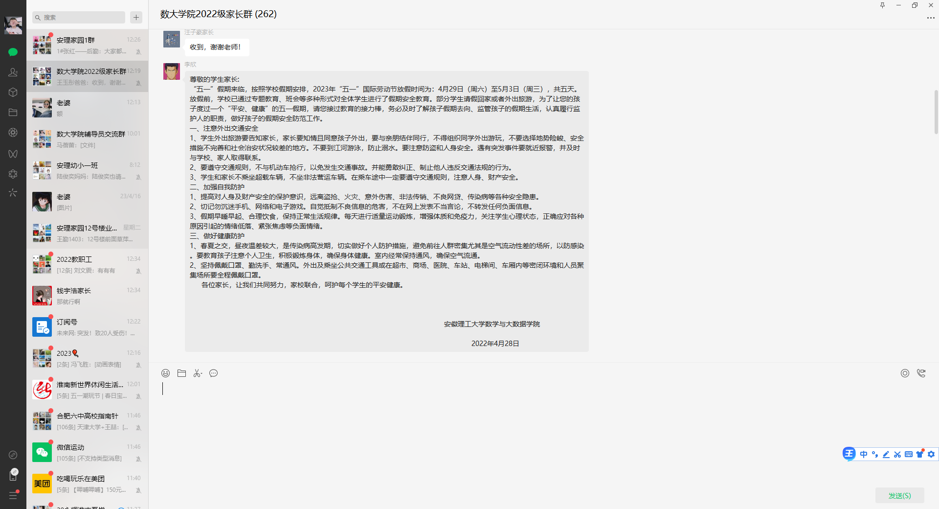 数大学院于各年级家长群发布《五一假期致家长一封信》,并和家长确认学生去向信息,家长要做到常教育、多陪伴、知去向、有监督,配合学校做好安全教育工作,真正做到信息互通。