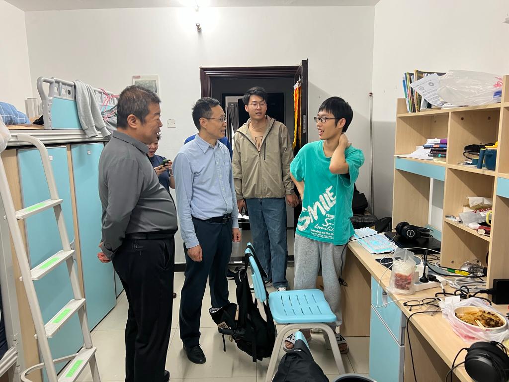 在学生宿舍里,数大学院党委书记谢中根与学生亲切交谈,详细了解同学们的学习和日常生活情况,鼓励同学们要勇于表现自我,敢于展示自身特长,保持阳光开朗、乐于表达的心理状态,珍惜在校时光。数大学院院长赵前进叮嘱同学们秋季早晚温差大,注意增减衣物,预防感冒,同时提醒留校学生注意宿舍用电安全,激励同学们要抓住发展际遇,做好人生规划,学好专业知识,提升自身价值。