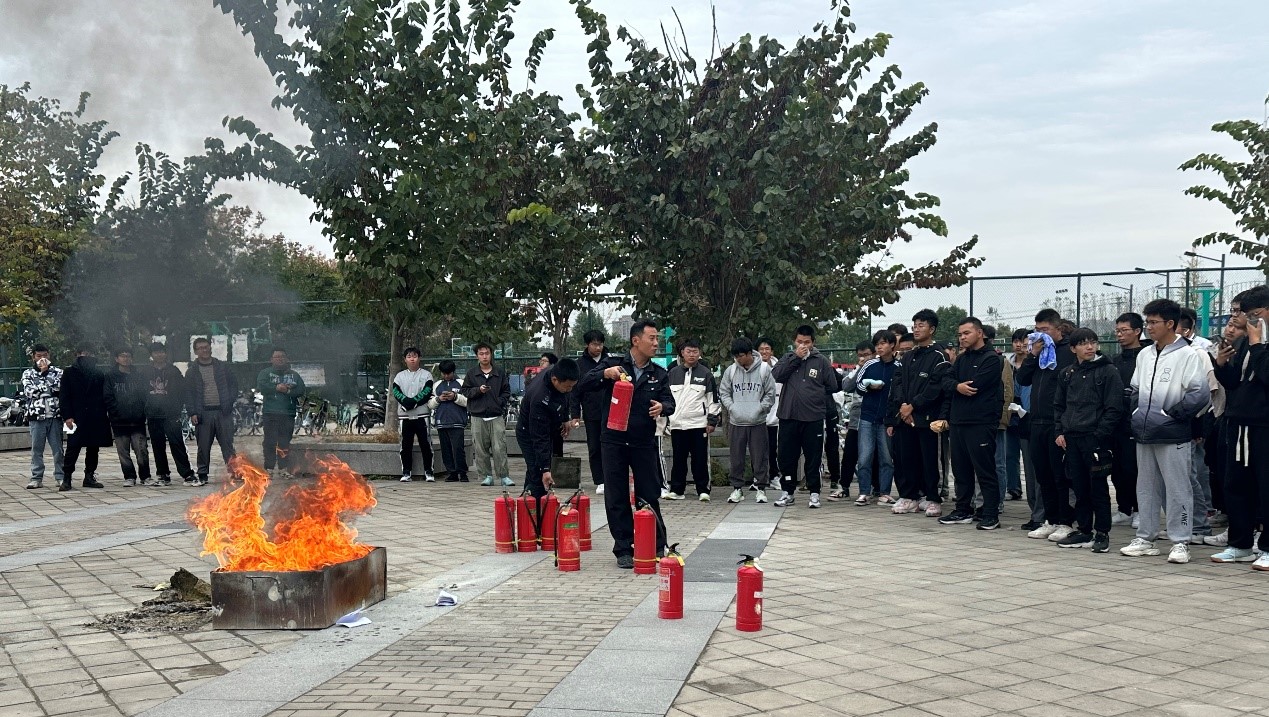在学生宿舍广场前,彭广峰向同学们演示灭火器的使用方法,并指导学生代表使用灭火器进行现场灭火演习。