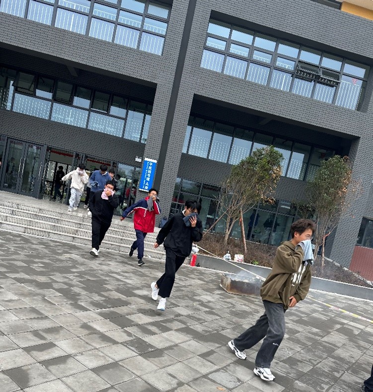 消防疏散演练中,随着消防警报声响起,辅导员老师根据先前制定的消防疏散演练方案,组织全体同学按照撤离路线进行疏散,同学们有序地从安全通道撤离到广场安全地带。