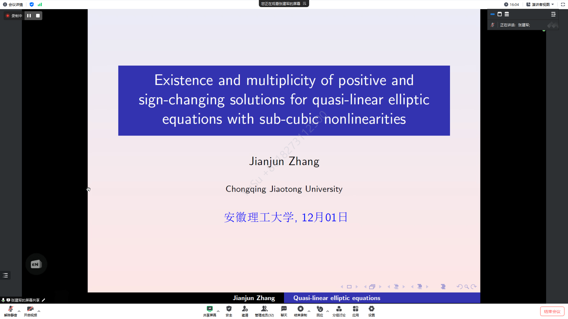 12月1日上午,应科研部和数大学院的邀请,重庆交通大学张建军教授通过腾讯会议作了“Existence and multiplicity of positive and sign-changing solutions for quasi-linear elliptic equations with sub-cubic nonlinearities”(具有次立方非线性项拟线性椭圆方程正解和变号解的存在性和多解性)的学术报告。学院微分方程与动力系统团队青年老师和研究生等40余人认真聆听了学术报告。
