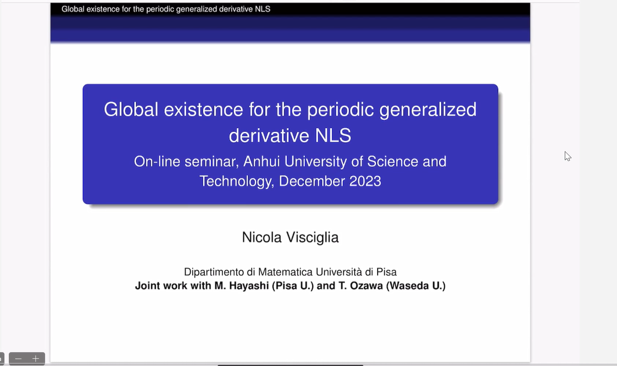 Visciglia教授首先介绍了广义导数非线性薛定谔方程的物理背景,然后详细分析了解关于时间的局部存在唯一性问题,然后应用调和分析方法和先验估计给出解关于时间的全局存在唯一性结果,最后列出关于二维和三维非线性薛定谔方程解的全局存在唯一性问题。