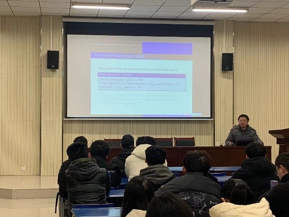 1月8日上午,应科研部、数大学院的邀请,北京理工大学胡峻教授及其博士生施磊在数大学院一楼报告厅分别作题为“On the Center Conjecture for the cyclotomic Hecke algebras of type G(r,1,n)”和“On the cocenter for the cyclotomic quiver Hecke algebras”的学术报告。院长赵前进教授主持报告会,学院相关专业教师、硕士研究生、本科生50余人认真聆听了学术报告。
