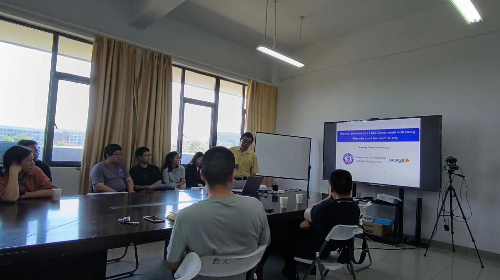 5月27日下午,加拿大罗瑞尔大学陈玉明教授和嘉兴大学刘炳文教授应邀分别做了题为“Dynamic behaviors of a Leslie-Gower model with strong Allee effect and fear effect in prey(考虑被捕食者具有强Allee效应和恐惧效应的Leslie-Gower模型的动力学行为)”和“动力系统研究中一些数学分析技巧”的学术报告。副院长段炼主持报告会,微分方程方向的青年教师和硕士研究生参加报告会。