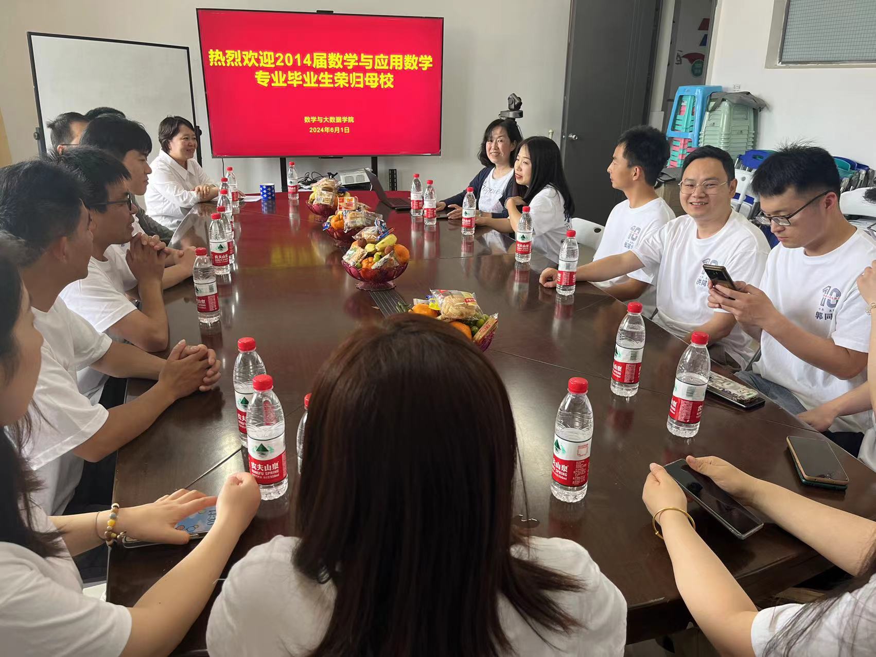 2024年6月1日下午,数学与大数据学院数学与应用数学专业2014届校友从祖国各地返回母校,参加毕业十周年聚会。学院在明道楼221会议室举办了师生座谈会,院党委副书记马蓓蕾、代课教师、辅导员等参加座谈。