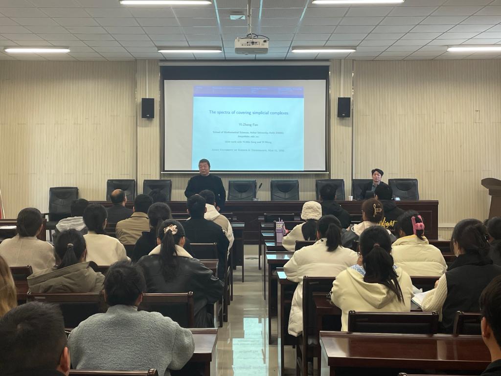 3月11日下午,应科研部、数大学院的邀请,安徽大学范益政教授在学院一楼报告厅作“The spectra of covering simplicial complexes”的学术报告。院长赵前进教授主持报告会,学院相关专业教师、硕士研究生、本科生100余人参加了学术报告。