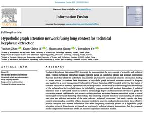 近日,安徽理工大学数学与大数据学院博士研究生赵雨杉在信息融合领域著名期刊《Information Fusion》(影响因子14.8,中科院一区Top期刊)发表题为“Hyperbolic graph attention network fusing long-context for technical keyphrase extraction”的研究论文,该成果标志着我院在自然语言处理与知识挖掘交叉领域取得重要突破,展现了我院博士研究生培养质量的显著成效。