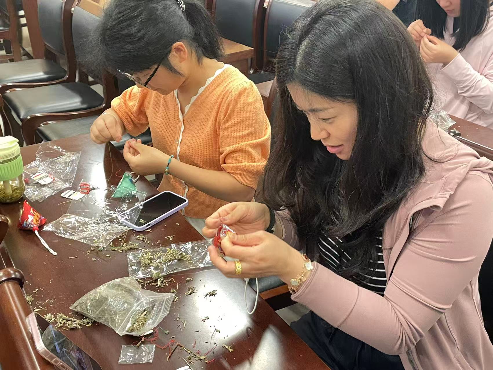 5月30日中午,老师们齐聚学院一楼报告大厅,大屏幕滚动播放香囊制作方法,配着鲜活的音乐,老师们纷纷动手,穿针引线,将艾草,香料等填充进香囊。不一会,各具特色的香囊跃然桌上。