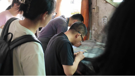 次日,队伍走进久负盛名的胡开文墨厂,浓郁的松烟香气扑面而来,一场与国家级非物质文化遗产—— 徽墨制作的亲密接触就此展开。在经验丰富的墨厂老师傅带领下,队员们近距离观摩了徽墨从点烟、和料、制墨、晾墨到描金等一系列繁复且精妙的传统制作工序。