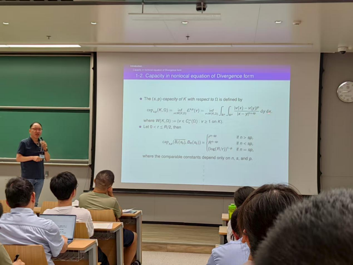 会议期间首尔大学Ki-Ahm Lee教授、北京大学周斌教授、仁川大学Yeonghun Youn教授、西安交通大学李东升教授、汉阳大学Seunghyeok Kim教授、湖南大学徐露教授、北京师范大学熊金钢教授、西江大学Hyunseok Kim教授、北京工商大学刘勇教授、庆北大学Jehan Oh教授、韩国科学技术院Jaeyoung Byeon教授、哈尔滨工业大学张超教授、西江大学Jihoon Ok教授、首尔大学Sun-Sig Byun教授、复旦大学张霜剑教授、安徽理工大学苏宇副教授、建国大学Taehun Lee教授、韩国科学技术院Beomjun Choi教授、武汉大学敖微微教授、首尔大学Jinmyoung Seok教授、北京大学周蜀林教授、首尔大学Yumi Cho教授、复旦大学黄耿耿教授等专家分别就非线性椭圆与抛物方程、非局部与分数阶方程、几何分析与曲率问题、流体力学与物理建模、数学物理系统与爆破解、最优化与经济数学、经典不等式与泛函分析、可积系统与孤子理论、Monge-Ampère方程与最优运输、双相问题与调制系数模型等热点问题作了精彩报告。