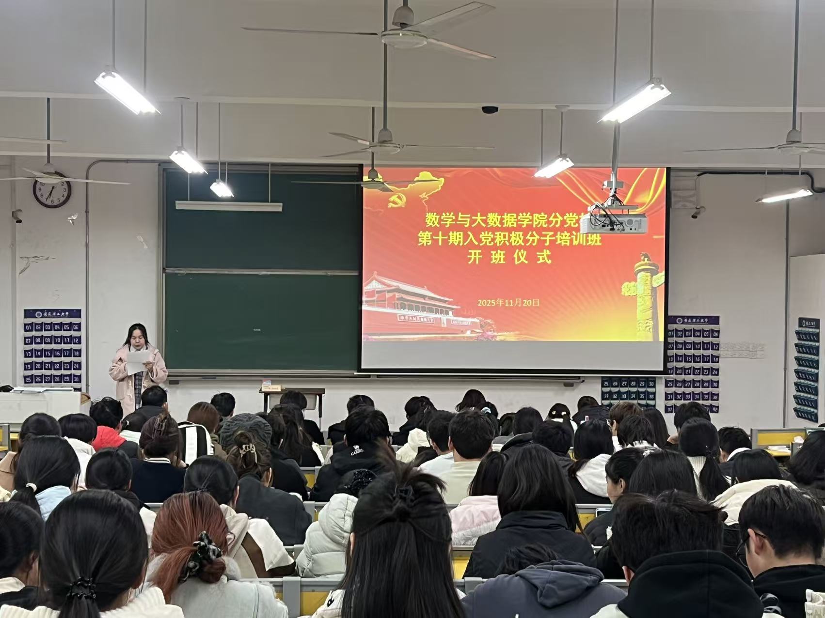 11月20日晚,数学与大数据学院分党校第十期入党积极分子培训班开班仪式在明理南214教室隆重举行。院党委书记马蓓蕾、学生辅导员及本期全体入党积极分子参加仪式。