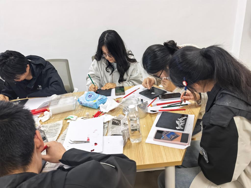 创作过程中,同学们迅速沉浸其中,现场氛围安静而专注。大家手持画笔蘸取漆料,从生疏试探到熟练创作,将内心情绪与生活感悟融入作品,或在流畅线条中平复浮躁,或在色彩搭配中释放负面情绪,或在大胆创新中融合青春朝气与非遗厚重。此次活动让学子近距离感受传统工艺的独特魅力,在沉浸式创作中收获成就感,学会在专注中调节情绪、在坚持中舒缓压力,实现 “以艺润心、以美怡情” 的心理疏导目标。