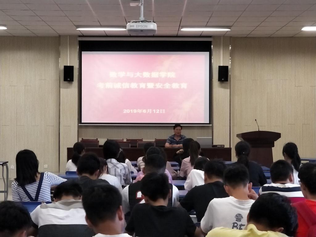 正值学期结尾,学生即将面临大学英语四六级考试以及本学期的期末考试。为进一步树立我院学生诚信观念,增强诚信意识,维护正常考试纪律,6月12日至13日,数大学院在学院报告厅分年级举行三场诚信考试专题教育,院党委副书记李勇主讲。