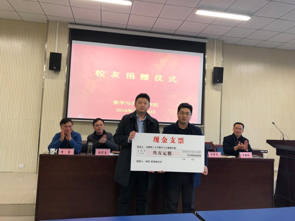 12月14日下午,数大学院在院报告厅举行校友捐赠仪式。信息与计算科学专业2010届优秀校友、北京汇恒通资产管理有限公司董事长田涛,校党政办主任、合作发展处处长王先江,院领导及相关师生代表120余人参加了仪式,院党委书记冯定昌主持仪式。