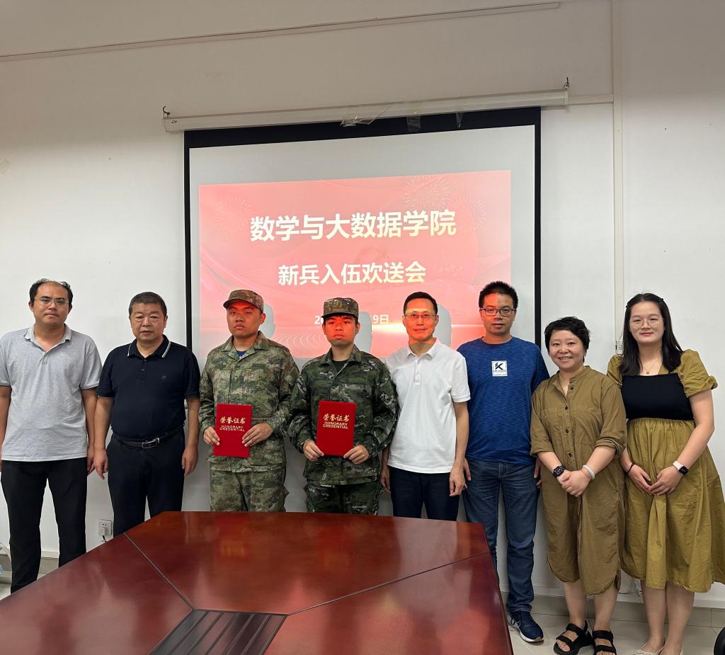 “有志学子赴军营,携笔从戎报家园”。9月19日上午,数学与大数据学院在明道楼204举行2023年秋季入伍新兵欢送会。学院领导班子成员、辅导员代表以及新入伍的学生参加了欢送会。会议由党委副书记马蓓蕾主持。